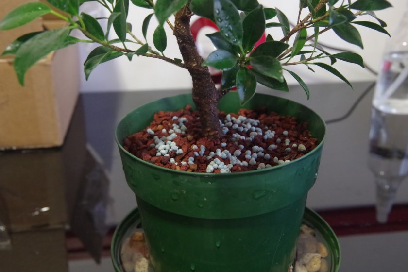 Полученной смесью проводить прикорневую подкормку. А если просто присыпать грунт в горшке золой, то это защитит почву от размножения вредителей домашних растений. Птичий помёт тоже подходит для удобрения фикусов. В 1 литре воды развести 3 или 4 грамма птичьего помёта. После обильного полива земли, светлым раствором уже можно удобрять ее. Минеральное удобрение для подкормки деревца – янтарная кислота. Это бесцветное кристаллическое вещество, хорошо растворимое в воде. Янтарная кислота отлично подкармливает фикус и оберегает от насекомых-вредителей: