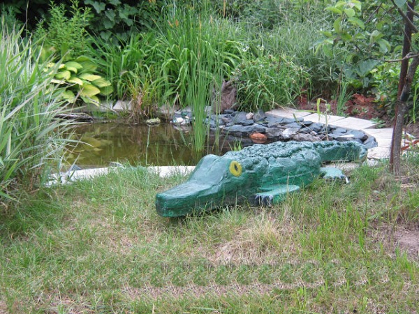Зубы крокодила крепятся аналогично, саморезами. Снизу, на брюшке должна быть проволока, с помощью которой можно зафиксировать фигуру на земле. Внутрь пасти тоже вставляют пластик.