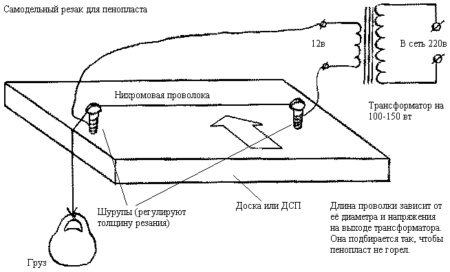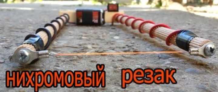 Резак из нихромовой проволоки. Практика работы с пенопластом показывает, что качественный спил образуется при использовании инструмента с нагретой проволокой. Края получаются ровные, гладкие, а крошки практически нет. К достоинствам метода можно приплюсовать высокую скорость резки и производительность в объёмах сходных с промышленными.