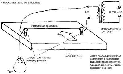 Из вышесказанного следует, что в зависимости от плотности пенопласта для его резки необходимо выбирать проволоку соответствующего диаметра, чтобы нихромовая проволока не расплавилась от выделяющегося на ней тепла. Чем выше плотность пенопласта, тем большего диаметра должна быть нихромовая проволока. Стоит заметить, что резаком, на котором установлена проволока для резки плотного пенопласта с успехом будет резаться и неплотный, только продвигать его надо будет быстрее.