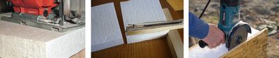 Для более ровного и плавного среза советуется нагреть лезвие перед работой. Также дома для резки можно взять болгарку или лобзик. Но при этом края будут неровными, слишком много шума от работы и отходов. Более толстый пенопласт (8-10 см) разрезают с помощью ножовки. Это быстрый и эффективный способ. Работу следует выполнять инструментом с небольшими зубчиками. Это сделает срез плавным.