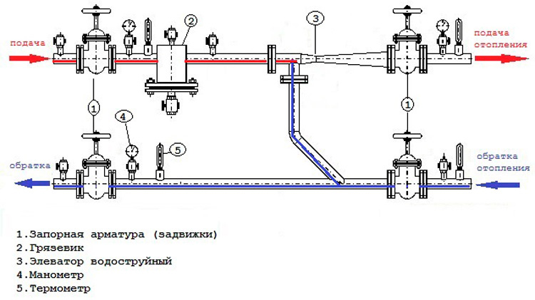 Тепловой узел многоквартирного дома оснащен главным элементом – элеватором отопления. Принцип работы этого агрегата можно сравнить с насосом. Под действием давления в камеру элеватора попадает вода из ТЭЦ и вода из обратки.
