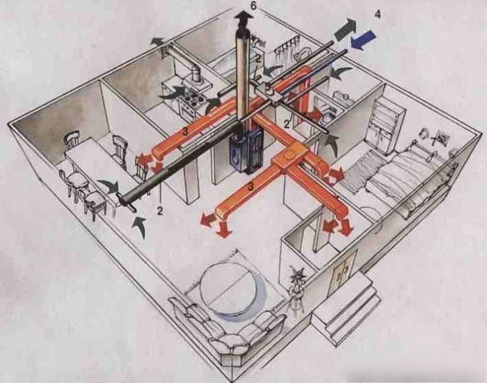 Однако отопление по такой схеме может иметь место, если оно не противоречит никаким правилам противопожарной безопасности или основным требованиям гигиены. Для такой отопительной схемы должна быть использована система приточной вентиляции, но воздух будет забираться не с улицы, а с тех помещений, которые отапливаются. В центральной воздушной отопительной системе применяются такие конструктивные виды приборов отопления, как: радиаторы, вентилятор, фильтры, воздуховоды и другие приборы.