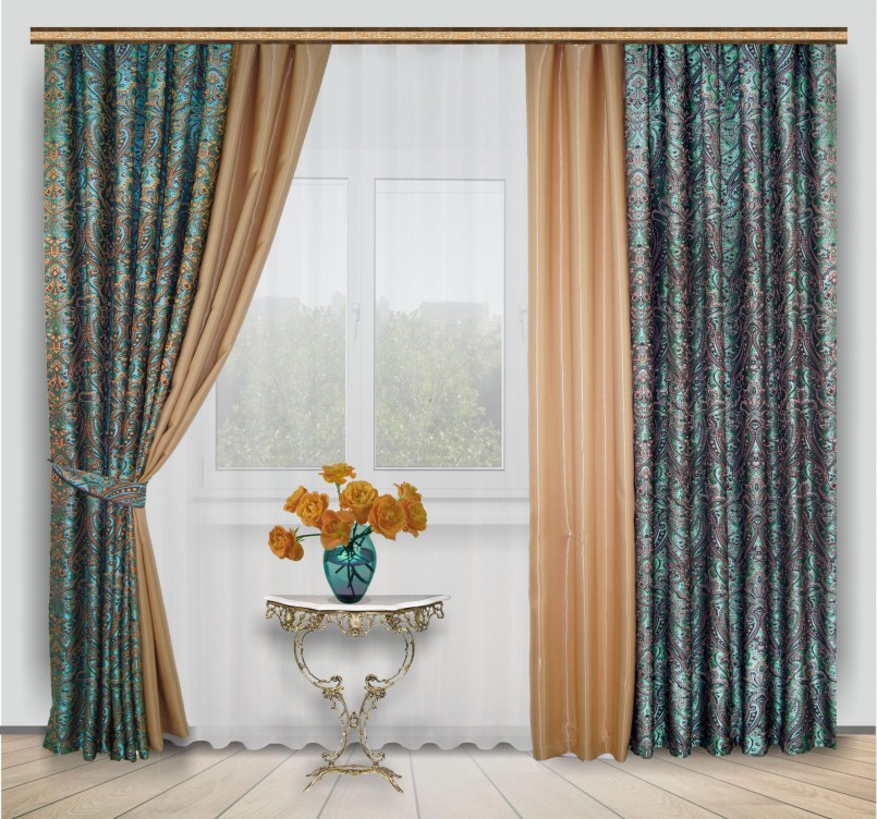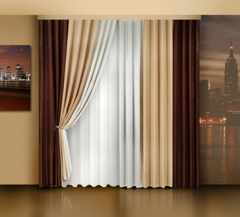 Светло-коричневые шторы, например, бежевые, сопровождаются орнаментом или узором более насыщенной тональности. Карамельные занавеси подчеркиваются легким кружевным тюлем.