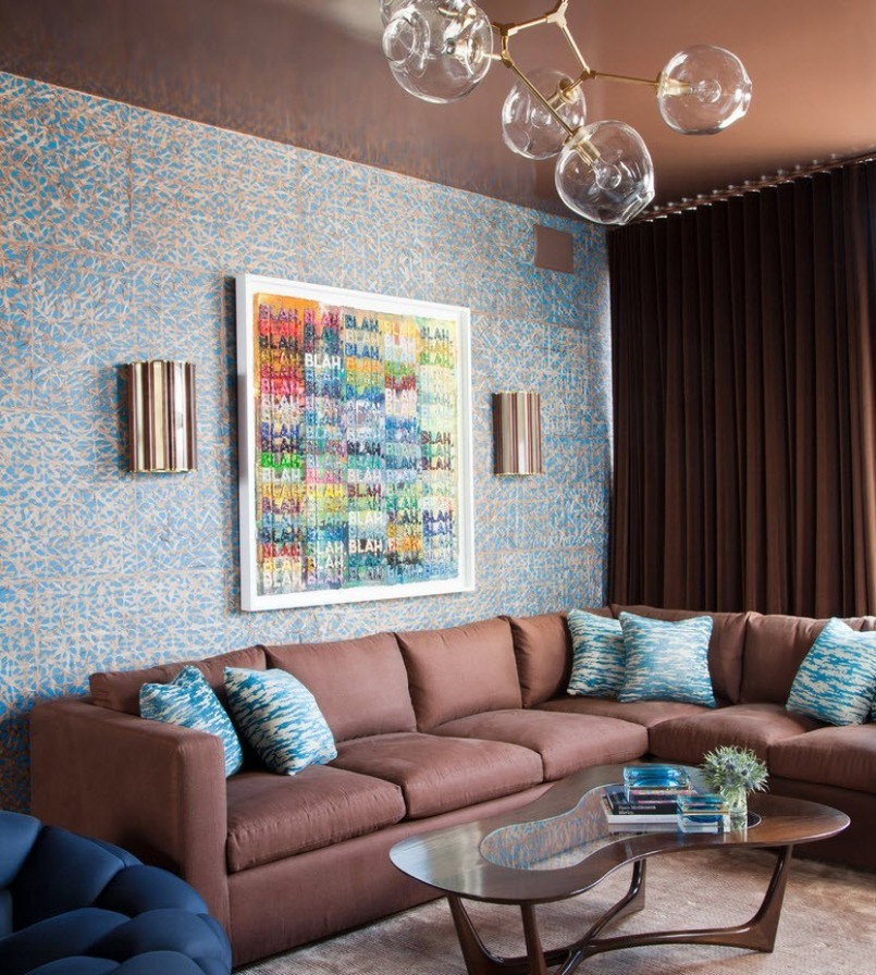 Интересным решением станет использование коричнево-голубых портьер, только в горизонтальных блоках, где темный станет превалирующим. Возможно сочетание и со светло-зеленым, мятным, бирюзовым, но в последних случаях необходимо добавлять в обстановку дополнительные детали в тон соседним.