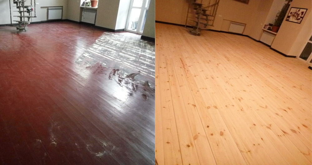 Осматривается крепеж настила: гвозди и саморезы должны сидеть глубоко, во избежание попадания под оборудование. Устраняется старое окрашивание. Если это была масляная краска/эмаль, можно избавиться от нее двумя способами:
