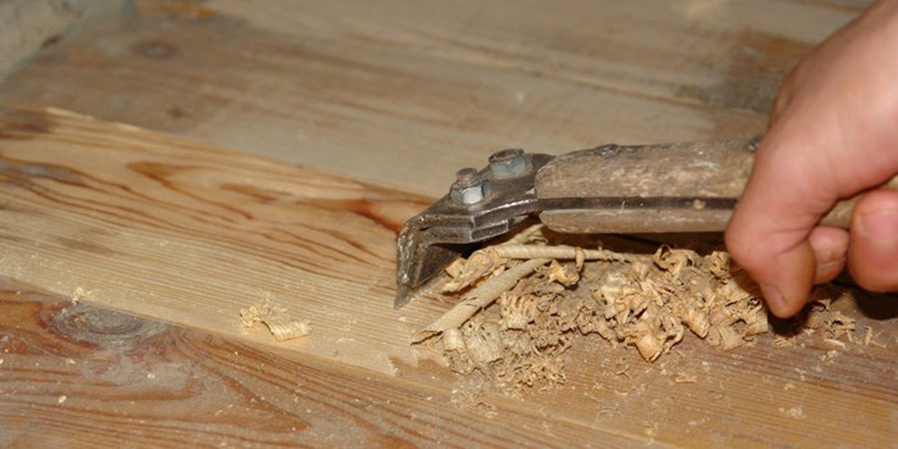 - Начиная от центра комнаты к ее краям, острой циклей снимают поврежденный лак вместе с тонким слоем дерева. Движения следует делать по текстуре волокон, прилагая определенные усилия. Периодически следует затачивать инструмент, чтобы он снимал равномерный слой паркета.