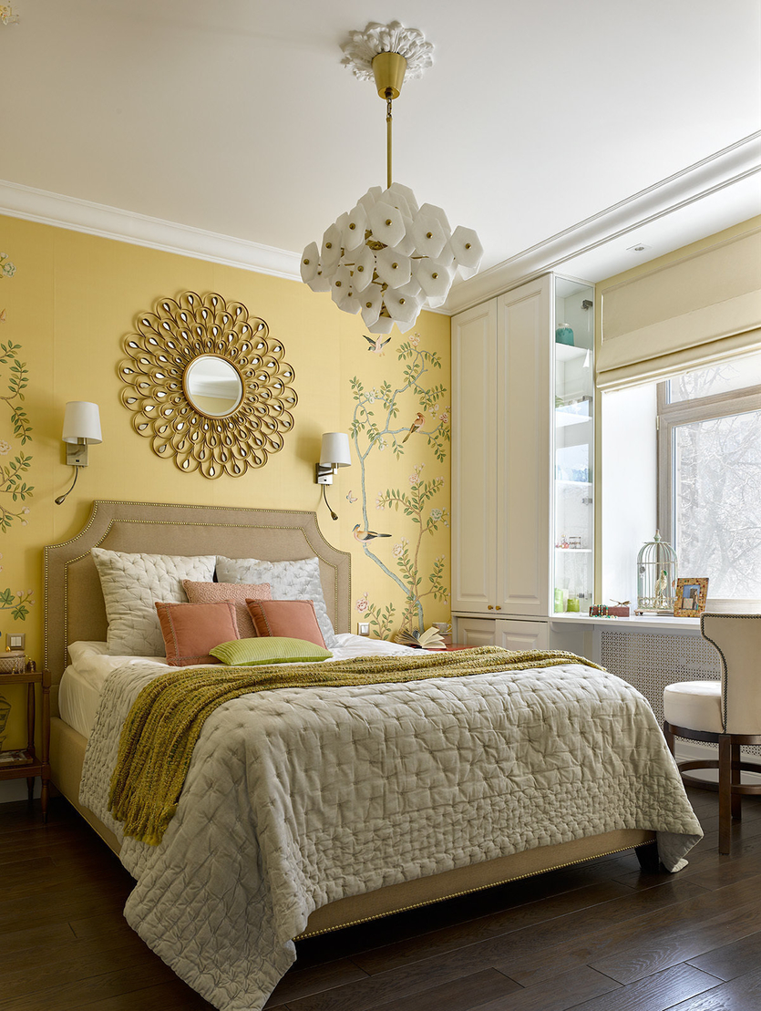 – оранжевый, желтый – яркие и бодрящие цвета не подходят для спальной зоны, не смотря на теплоту оттенка. Оранжевый – вызывает быстрое утомление глаз (исключение – светлые терракотовые оттенки), насыщенный желтый – негативно действует на энергетику спящего человека. Такие цвета хорошо использовать в качестве аксессуаров – прикроватных подушечек и покрывала, торшеров, картин. А для основного цвета – только производные оттенки – бежевый, песочный, молочный – беспроигрышный вариант для любого интерьера, особенно в египетском, арабском, японском и других этно-стилях;