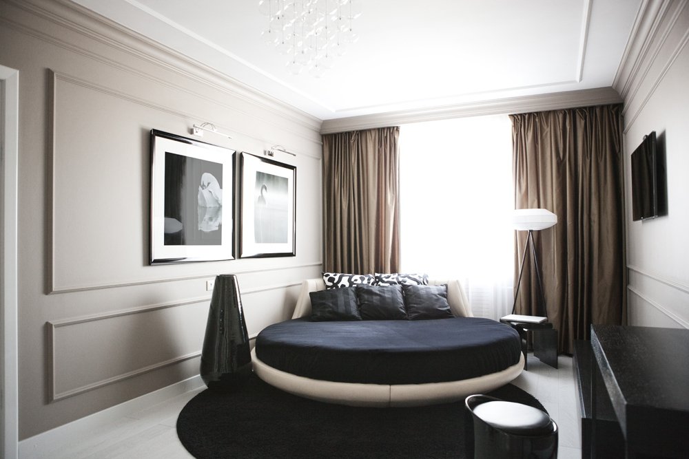 – черный – не смотря на нетривиальность такого выбора для спальни, он, как и все темные оттенки, превосходно успокаивает, способствует крепкому сну, а помимо этого, не лишен сексуальности и загадочной таинственности. Впрочем, в «чистом» виде черные спальни встречаются редко, чаще в комбинациях с белым, серебристо-серым, золотистым и бежевым. Интерьер в черном цвете подойдет для спальни в стиле лофт, хай-тек, авангард, модерн;