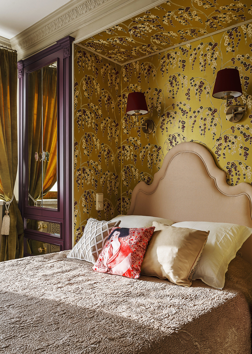 В спальне с маленькой площадью отличным фрагментом можно выделить только участок над изголовьем, а остальные стены оклеить светлыми обоями или окрасить. Хорошими решениями для спальной комнаты считаются оттенки бежевого, желтого, нежно-розового, персикового цветов.