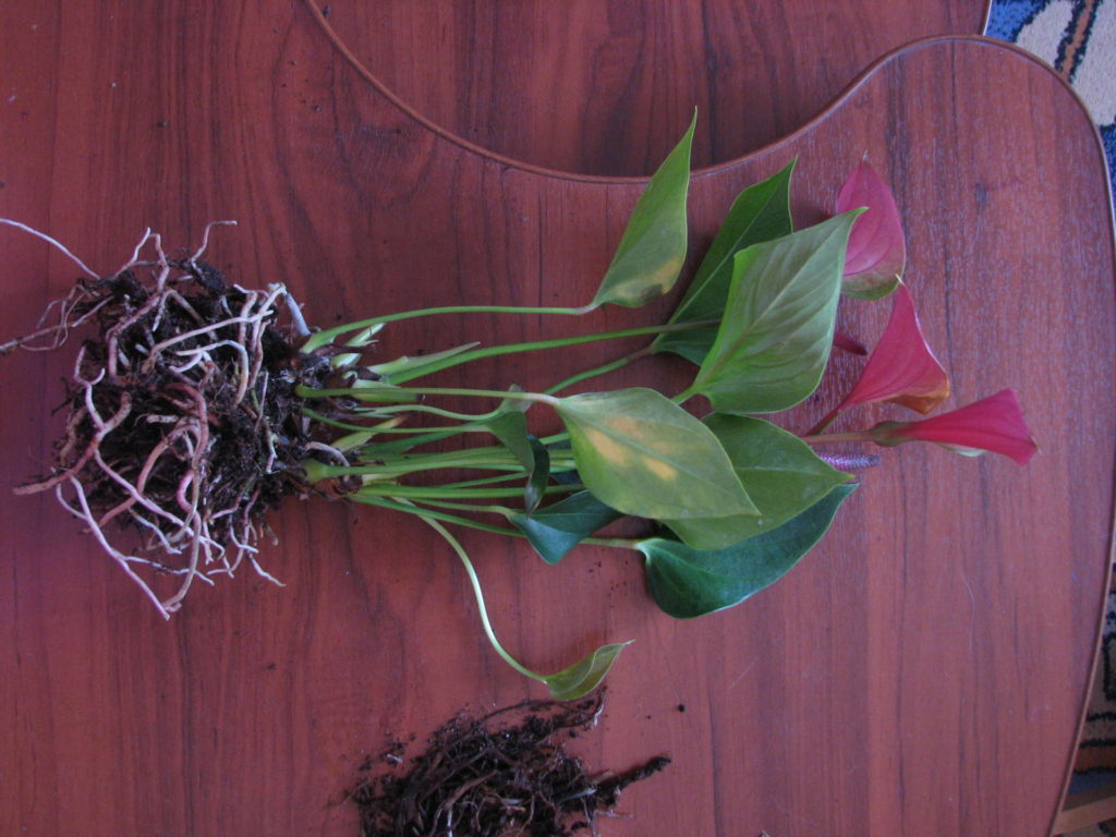 Корни у цветка фламинго хрупкие и могут сломаться от неосторожного прикосновения. Если в процессе перевалки обнаруживаются подгнившие или сухие корешки, их удаляют, а места срезов дезинфицируют