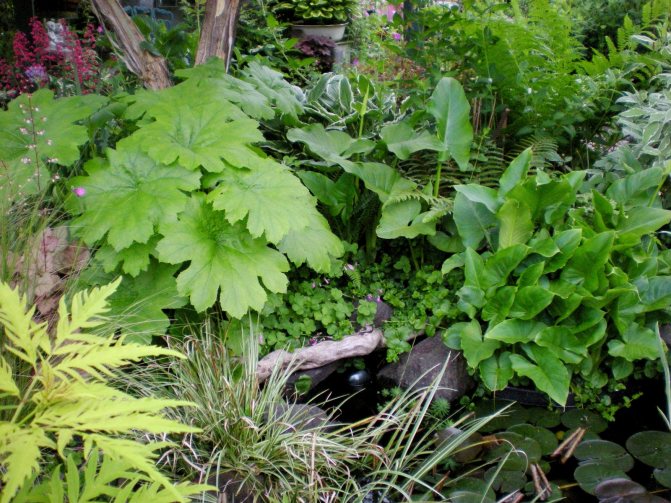 Особенно дармера красива рядом с различными кустарниками и крупными лиственными деревьями. Пельтифиллум можно высаживать в качестве украшения берегов водоемов. Но стоит учесть, что небольшие декоративные прудики массивный куст укроет своей листвой.