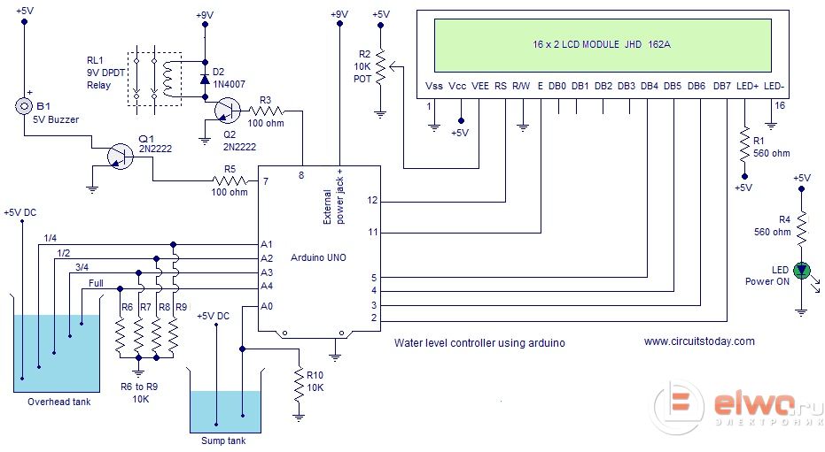 Схема уровня воды с помощью контроллера Arduino показано выше. Датчик в сборе состоит из четырех алюминиевых проволок длинной в 1/4, 1/2, 3/4 и полный уровень в баке. Сухие концы этих проводов подключены к аналоговым входам A1, A2, A3 и A4 Arduino соответственно. Пятый провод размещен в нижней части бака. Резисторы R6 – R9 уменьшают потенциал входов. Сухой конец провода подключен к +5V DC. Когда вода касается конкретного зонда, происходит электрическое соединение между зондом и +5V, потому что вода обладает некоторой электропроводностью. В результате ток течет через зонд и этот ток преобразуется в пропорциональное ему напряжение. Arduino читает падении напряжения по каждому из входных резистор для зондирования уровня воды в баке. Транзистор Q1 включает зуммер, резистор R5 ограничивает ток базы Q1. Транзистор Q2 управляет реле. Резистор R3 ограничивает ток базы Q2. Переменник R2 используется для регулировки контрастности ЖК-дисплея. резистор R1 ограничивает ток через его LED подсветку. Резистор R4 ограничивает ток через светодиодный индикатор питания. Полную программу для контроллера на Arduino можно загрузить тут.