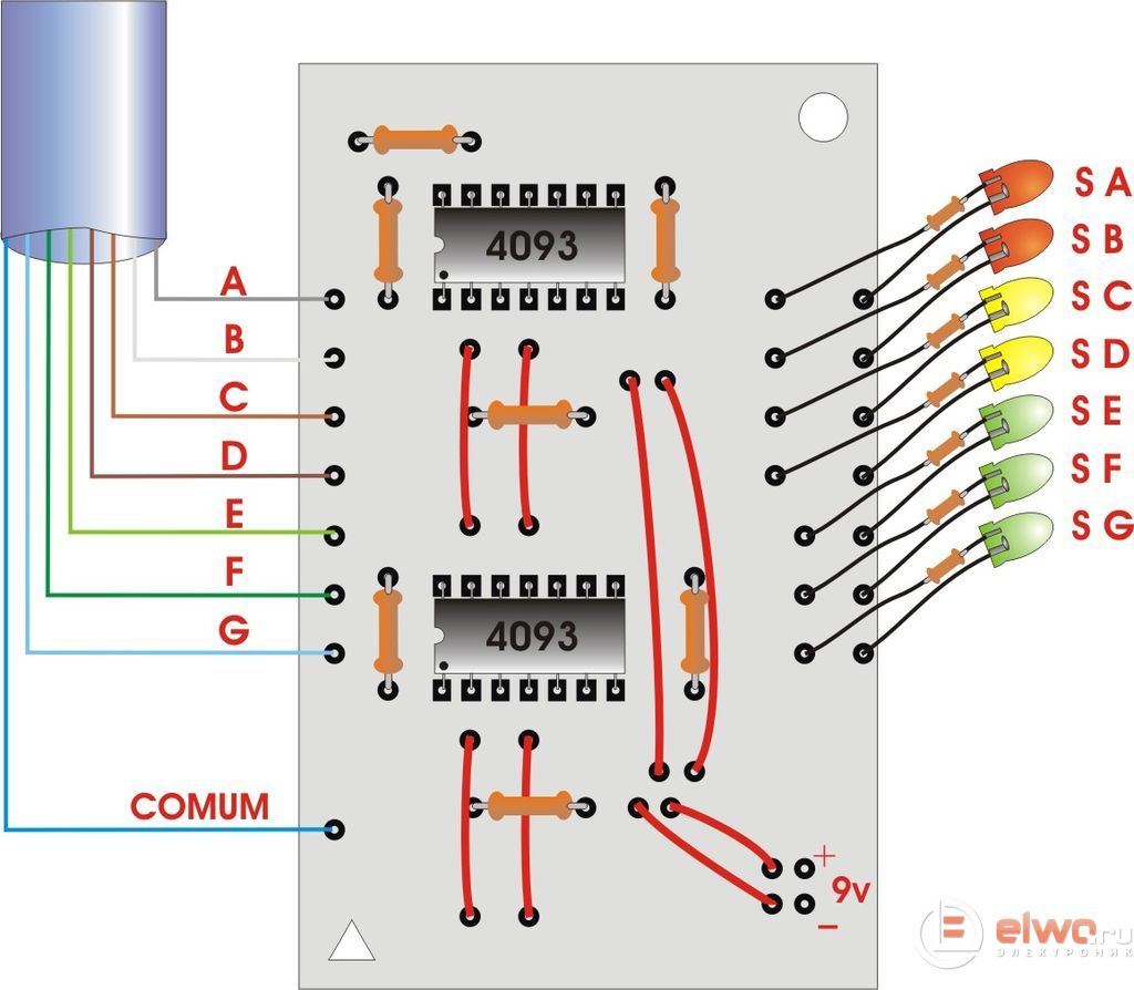 Итак, основа – это CI4093, что имеет четыре элемента. В этом проекте использовано две микросхемы. Тут мы имеем порты с одним входом на высоком уровне, а другие подключенные через резистор, обеспечивая высокий логический уровень. При помещении в эту логику нулевого входного сигнала, выход инвертора будет на высоком уровне и включает светодиод. Всего использовано семь из восьми элементов, из-за ограничений в кабельной сети.