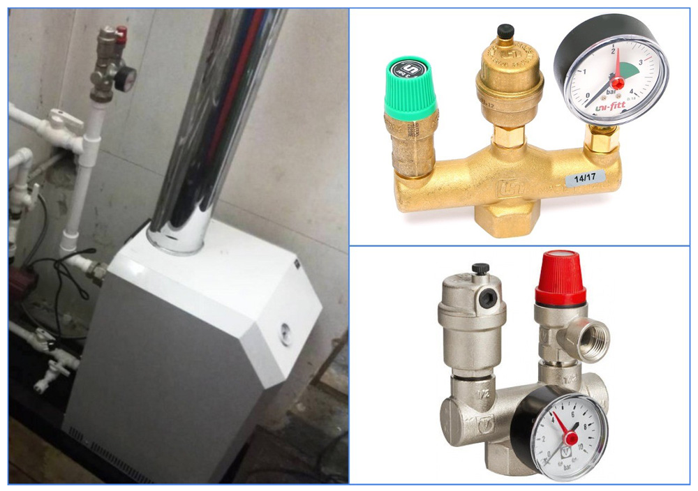- Обязательное присутствие над котлом арматурных устройств группы безопасности, состоящей из манометра, автоматического воздухоотводчика и спускного клапана. Указанные приборы требуются для настройки, развоздушивания и зашиты котла от избыточного давления.