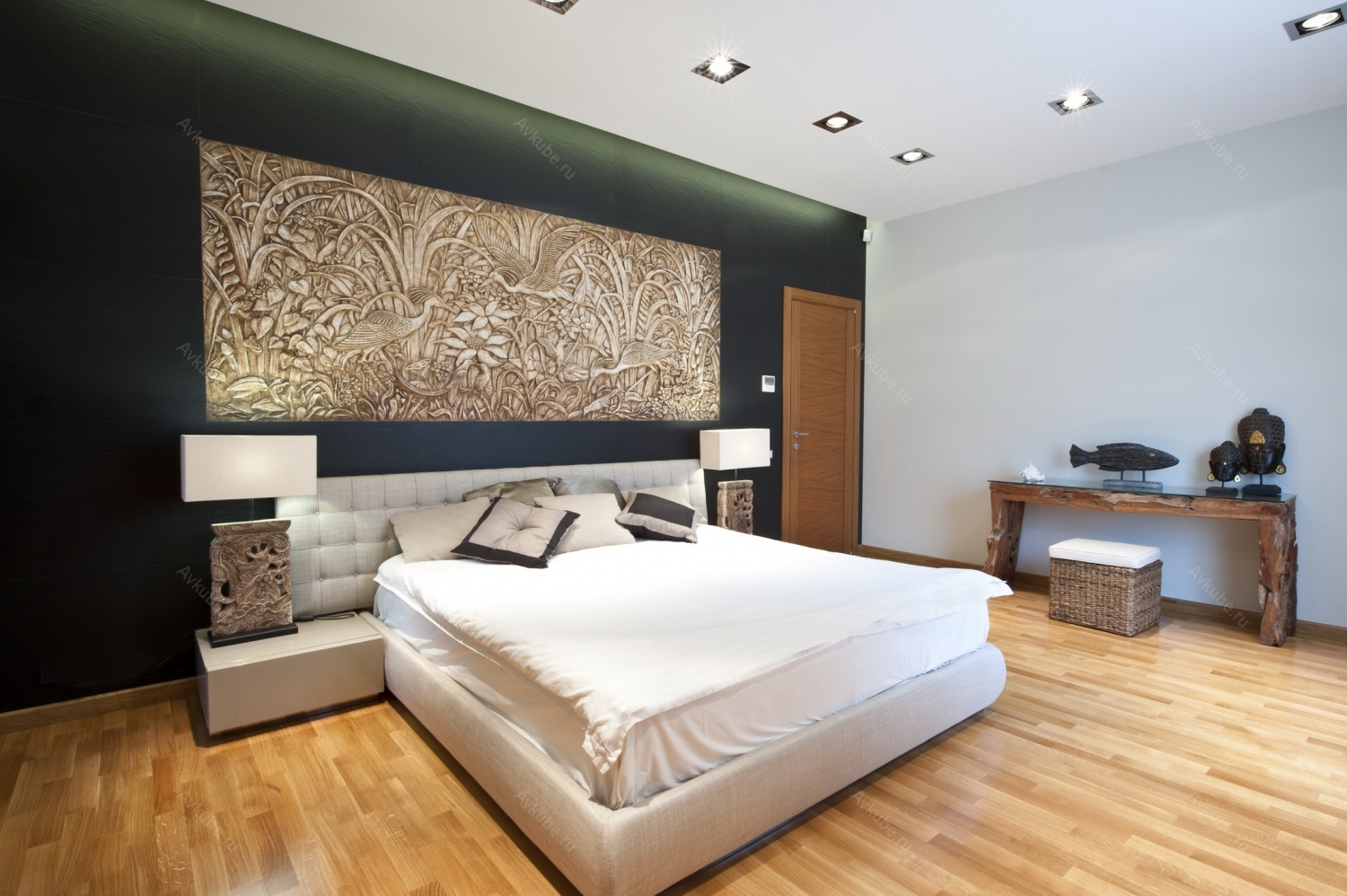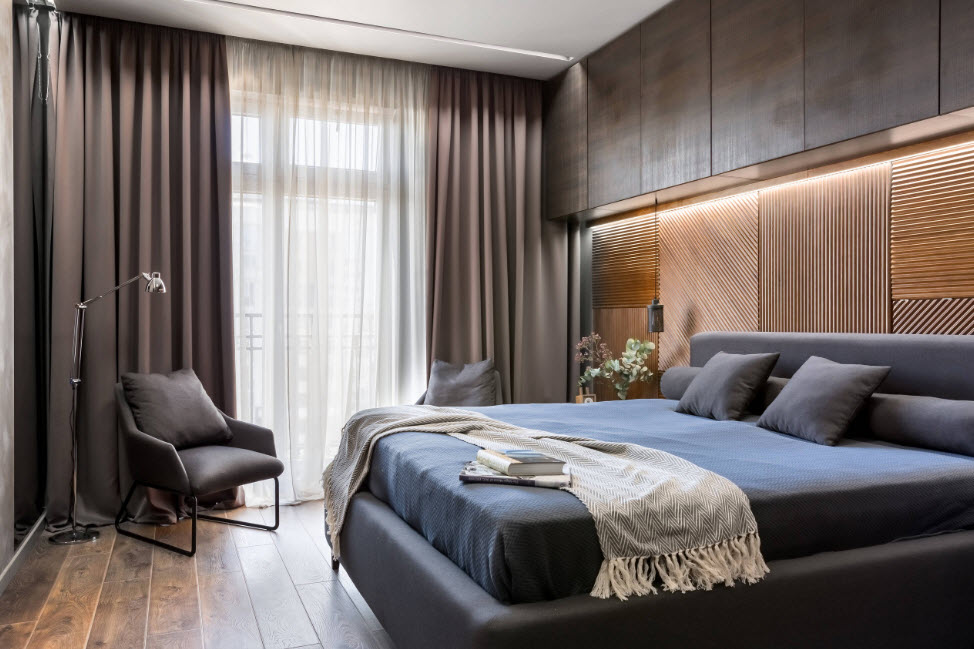Ни с чем не спутаешь изголовье, отделанное в стиле контемпорари. Оно имеет системы сложных ниш и выступов, а также приятную кожаную обшивку.