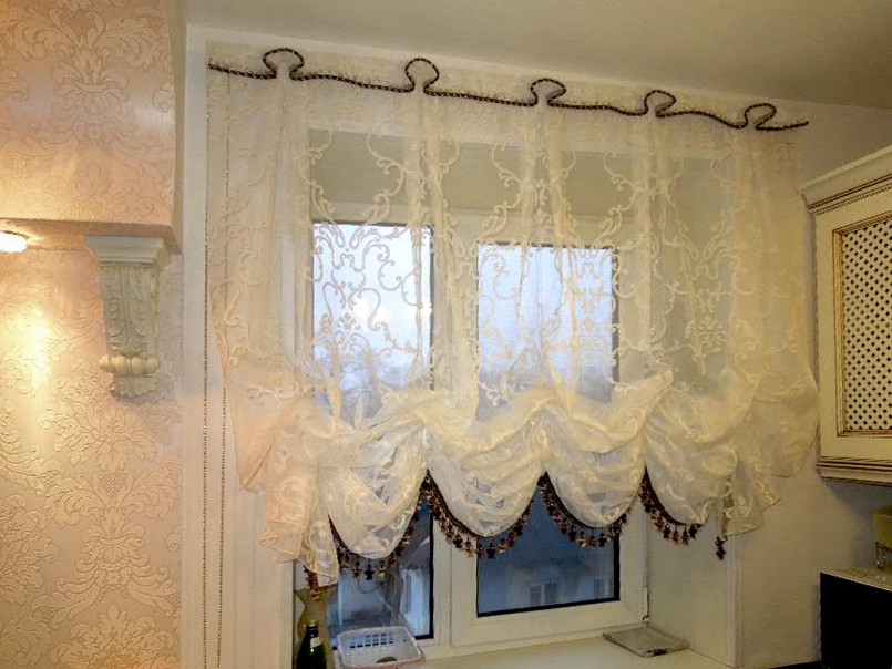 Выполняется подхват из бус, шнуров. В качестве декора рулонных штор выступают банты, кисти, кружево. Для кухонного пространства и гостиной подойдут изящные неброские элементы. В зависимости от предназначения помещения подвязки выполняют из ткани, шнуров или галстуков.