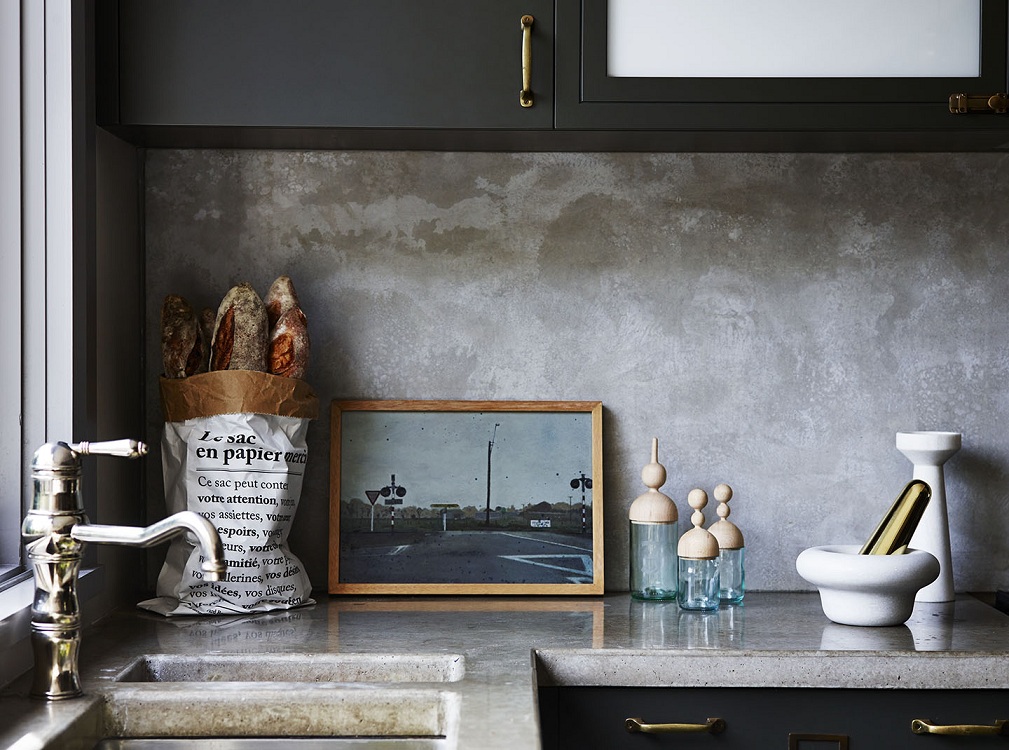 - под бетон. Оформление комнаты таким материалом позволит создать дизайн с уклоном на хай-тек, минимализм, техно. Состав идеально сочетается с любым гарнитуром, может придать строгость зоне готовки. Однако для сохранения первозданного вида фартука его потребуется защитить прозрачным материалом, например, стеклом. Бетонное покрытие можно сделать гладким или придать ему шероховатую текстуру;