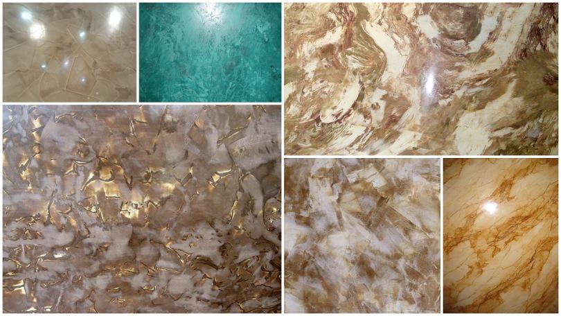 - венецианская. Придает стенам блеск. Покрытие получается глянцевым, бесшовным. Иногда целесообразно предусмотреть рисунок, что делается при помощи различных добавок;