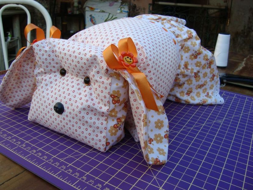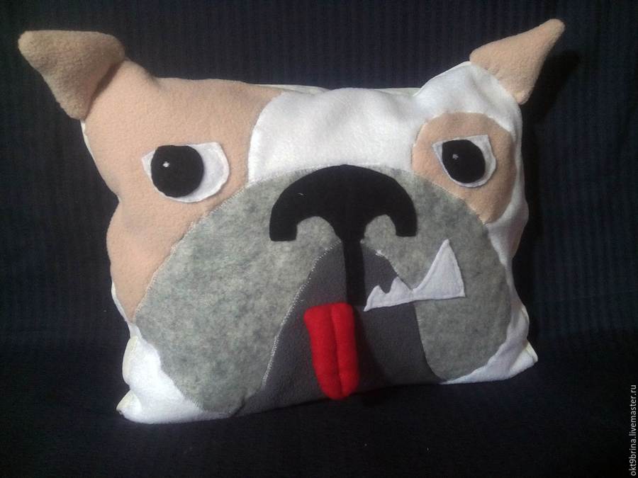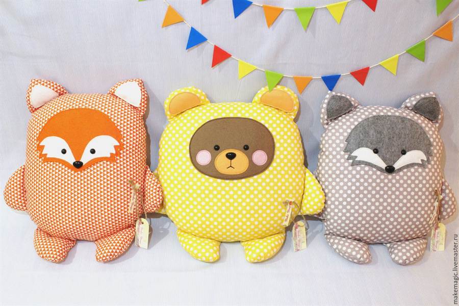 Подушку-игрушку можно делать и по простым выкройкам: квадратная подушка, декорированная под какого-нибудь зверька. Можно «обновить» уже имеющуюся подушку аппликациями из ткани (мордочка, глазки, усики) и дополнительными элементами (лапы, хвост), сделав ее игрушкой.