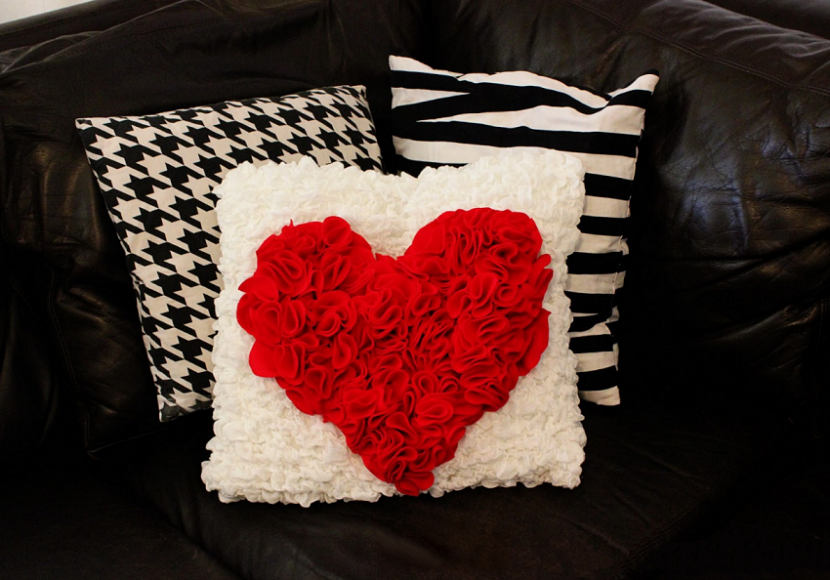 Когда все цветки готовы, выкладываем из них на подушке сердечко, начиная с его контура и постепенно заполняя внутреннюю часть. Пришивайте цветки достаточно плотно, чтобы сердце получилось «густым».
