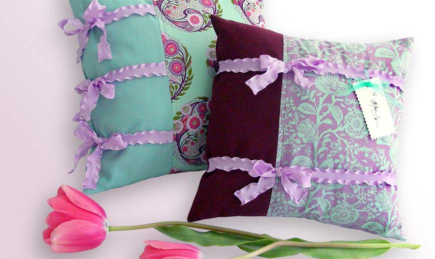 Ещё одним элементом декора является вышивание с помощью ленточек. Подушечки, обшитые ленточками, выглядят очень эстетично. С помощью ленточек можно создавать различные фигурки в виде узоров, бантов, цветочков. Вышивание лентами происходит довольно легко и непринуждённо. Такой вид отделки будет по нраву начинающим мастерицам.