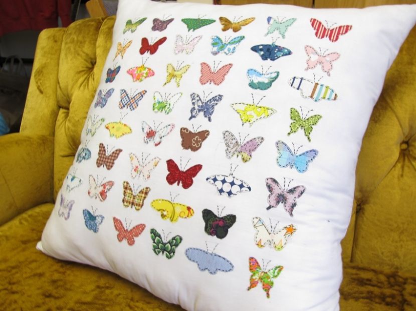 Так же украшать декоративные подушечки можно аппликацией. Вы можете нанести на изделие различные эмоциональные реакции в виде смайлов, делать подушечки-буквы. Допускается совмещение разных технологий. Можно применять сразу вышивание ленточками вместе с вязанием, соединять аппликацию с буфами.