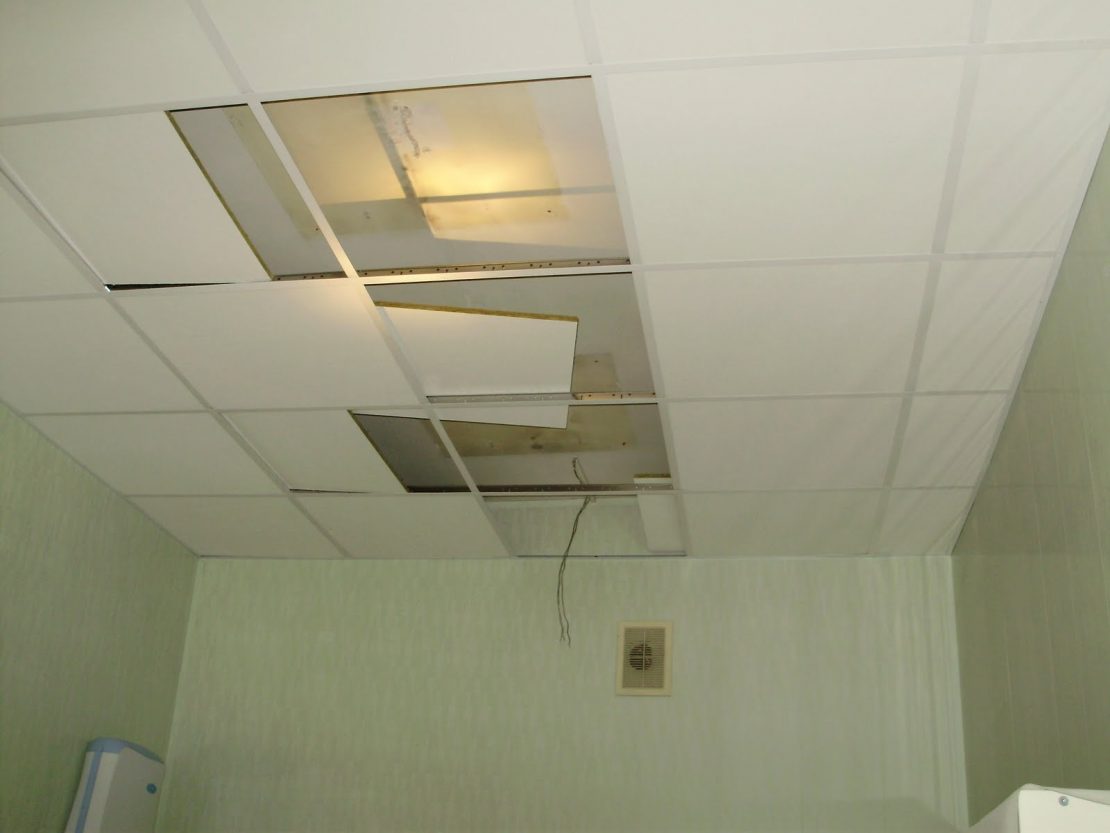 - Снять глухие потолочные плиты. Элементы не прикрепляются к каркасу, поэтому снимать их просто – приподнять деталь, повернуть по диагонали, вытащить.