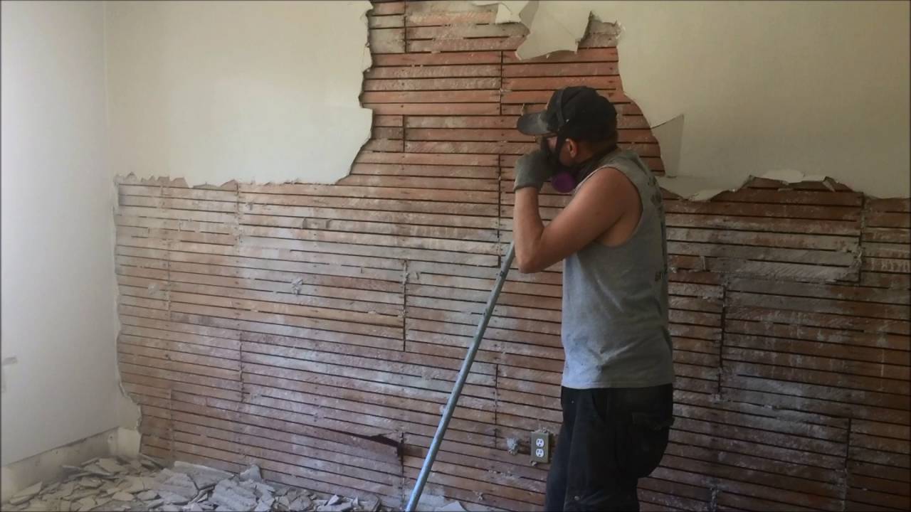 - Разрушение начинают с проема двери, либо с центра. Чтобы избавиться от лишней пыли, поверхность следует сбрызнуть водой.