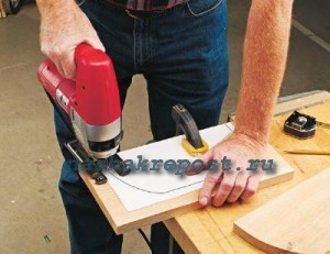 Затем с помощью элетролобзика аккуратно выпиливаем боковую часть, наложив трафарет поверх доски и надежно укрепив ее. То же самое проделываем со второй доской.