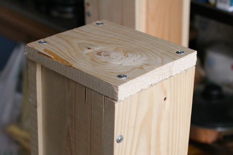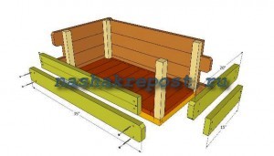 Прикрутив к полученному основанию четыре вертикальных бруска, размером 50×50 мм, формируем боковые стенки и дно .