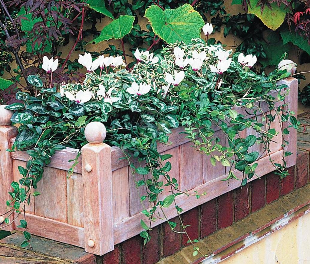 - Для изготовления таких ящиков используются различные породы дерева. От разрушительного воздействия света и влаги древесину защищает специальное покрытие. В них можно высаживать как комнатные цветы, так и однолетние растения.