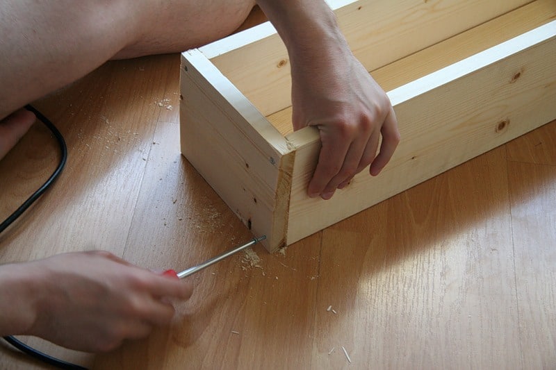 Первым этапом работы является скрепление несущих брусков между собой. На рисунке далее показано, как с помощью саморезов они надежно соединяются межу собой, становясь основой для последующего конструирования ящика.