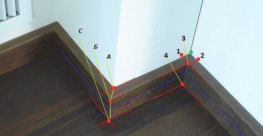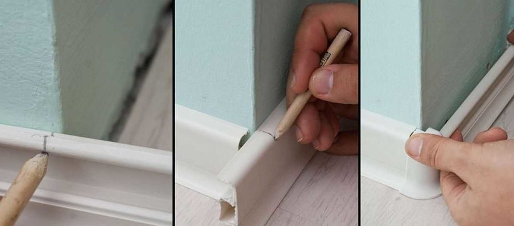 Далеко не все углы имеют ровно 90 градусов. Если отклонение небольшое, щели можно убрать при помощи наждачной бумаги. В других случаях придется размечать и резать с учетом реального градуса. Основная задача в этом случае найти точку на полу, где два плинтуса будут стыковаться.