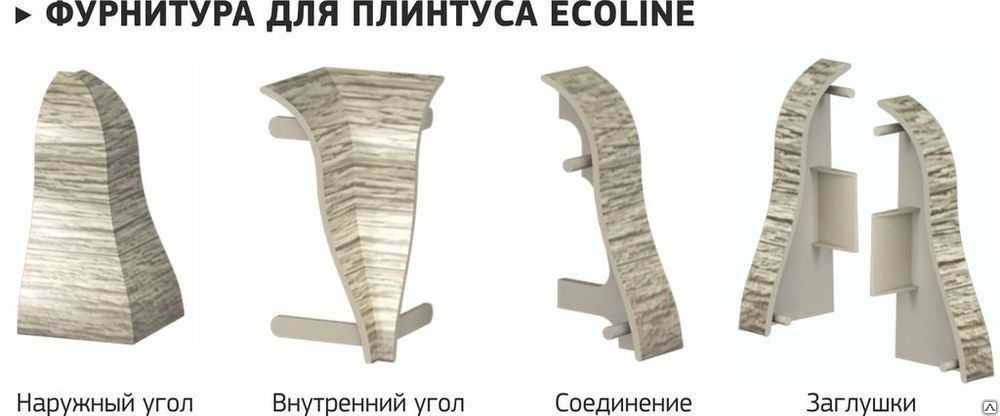 Наличие ассортименте производителя вспомогательных аксессуаров (наружные, внутренние, торцевые и стыковочные уголки, крепёжные клипсы) облегчает монтаж и стыкование плинтуса на углах, позволяет избежать запиливания и точной подгонки его по длине, а также придать законченный вид помещению.
