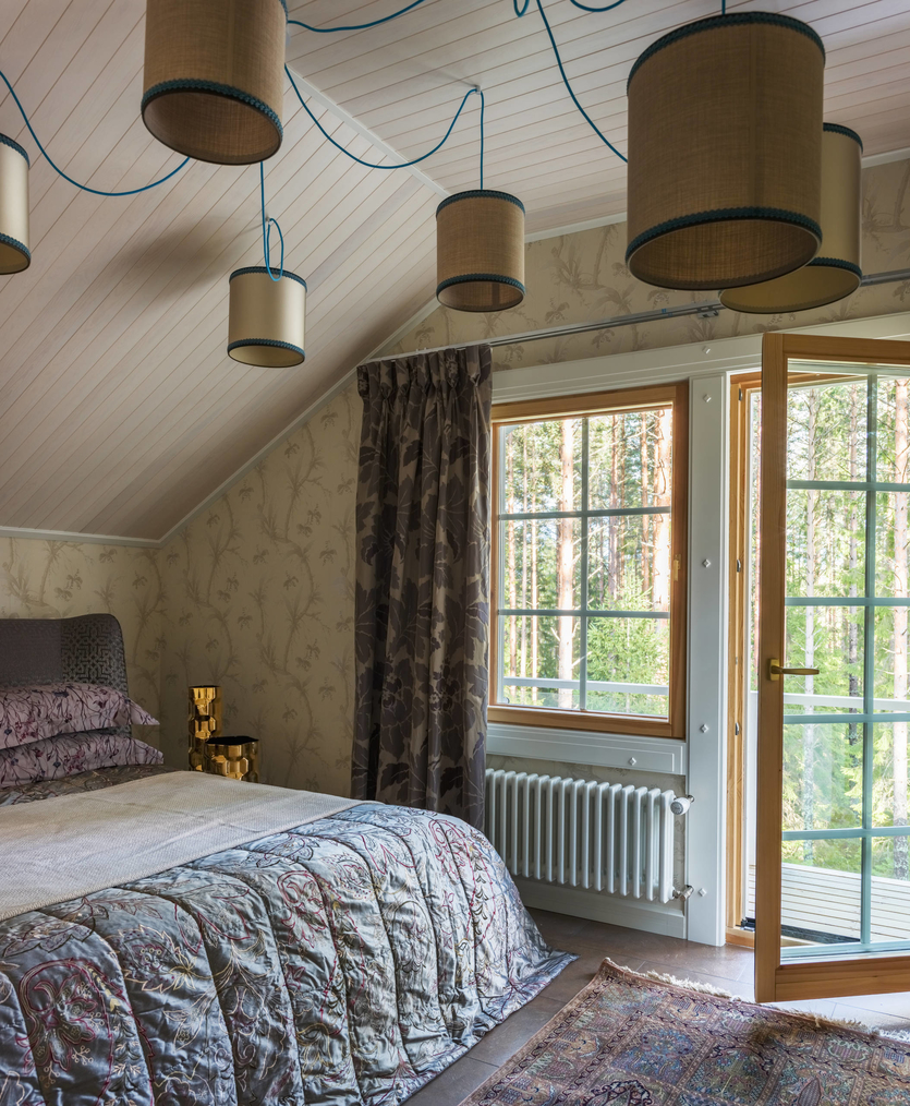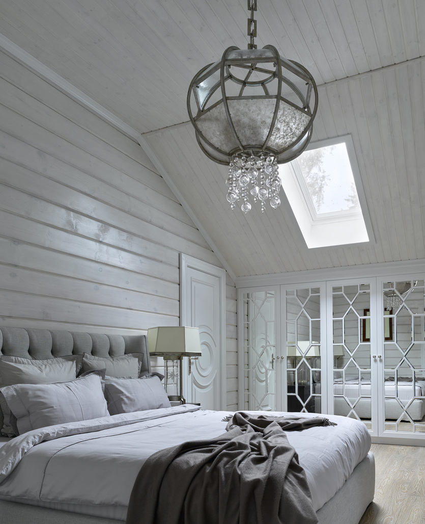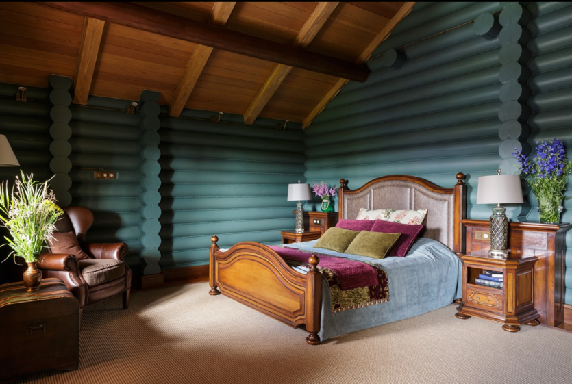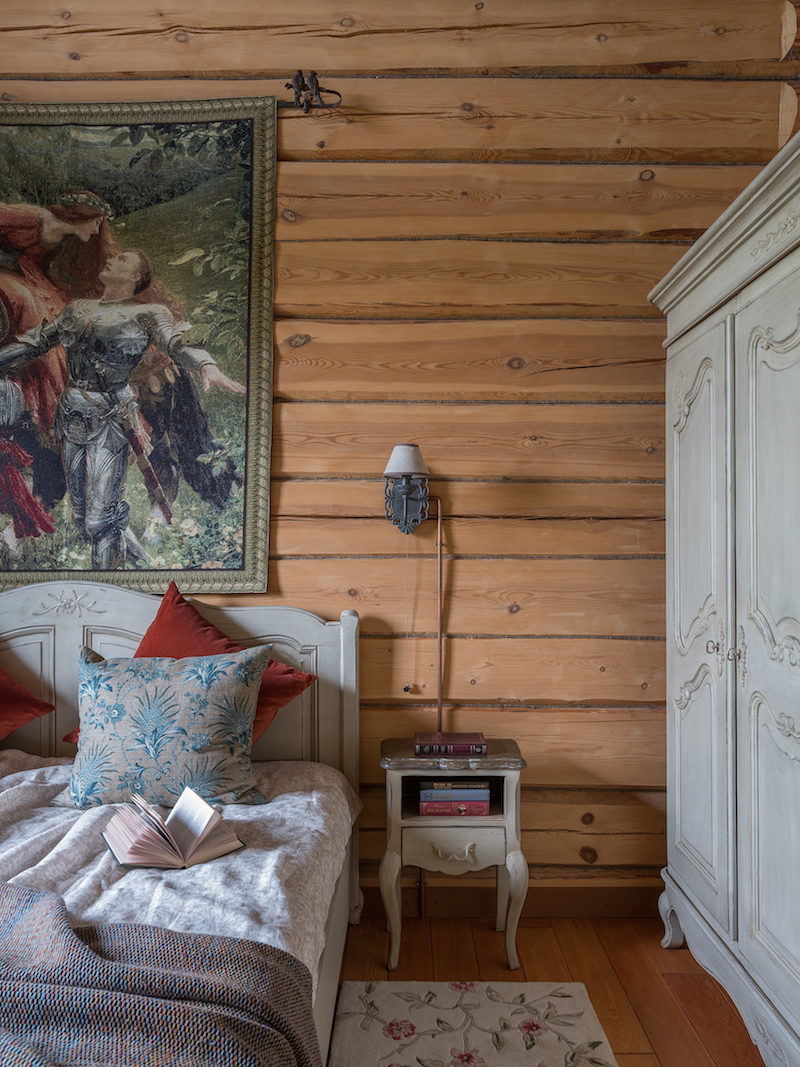 Например, оклеить ими одну стену в изголовье, предварительно выровняв ее гипсокартоном. Не стоит брать что-то контрастное основной тональности древесины: пусть дизайн обоев перекликается с заданной палитрой и дополняет ее как компаньон.Если оформляется интерьер спальни в деревянном доме в мансарде, а кровать находится как раз под скосом потолка, хорошей идеей будет оклеить обоями этот участок: разглядывать что-то, лежа на кровати, всегда приятно.