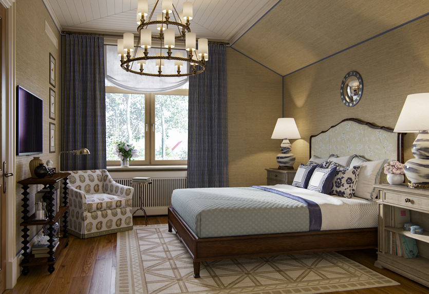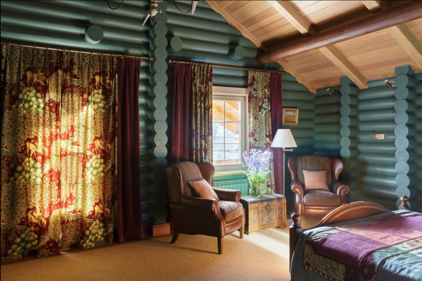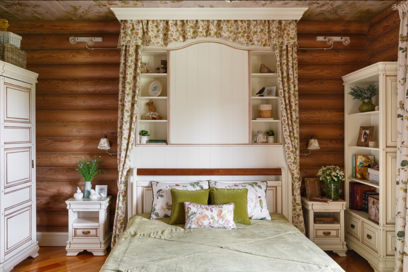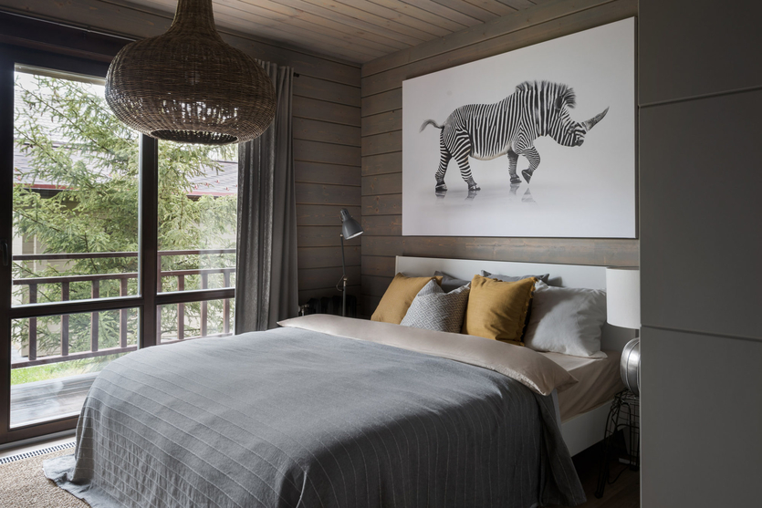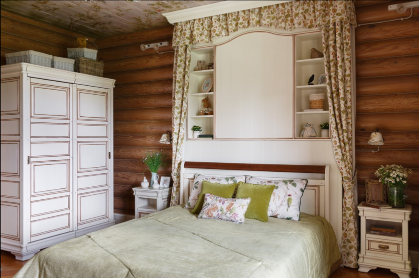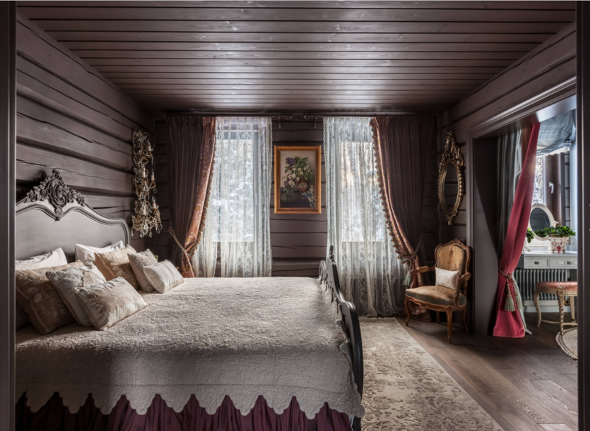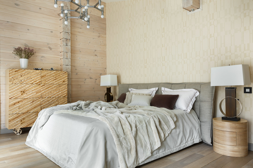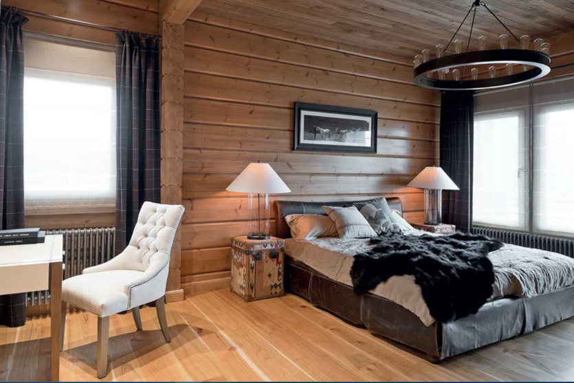 Шале. Эстетика уютных домиков лыжных курортов прекрасно впишется и в спальню дома любого российского коттеджного поселка. ДНК этого стиля — акцент на «зимние» плотные ткани, удобную низкую мебель, ретро-декор. Колеровать древесные поверхности можно как темными, так и светлыми оттенками.В такой спальне есть смысл ввести в интерьер обои. Подойдут покрытия, принтованые мелкими цветами или клеткой.