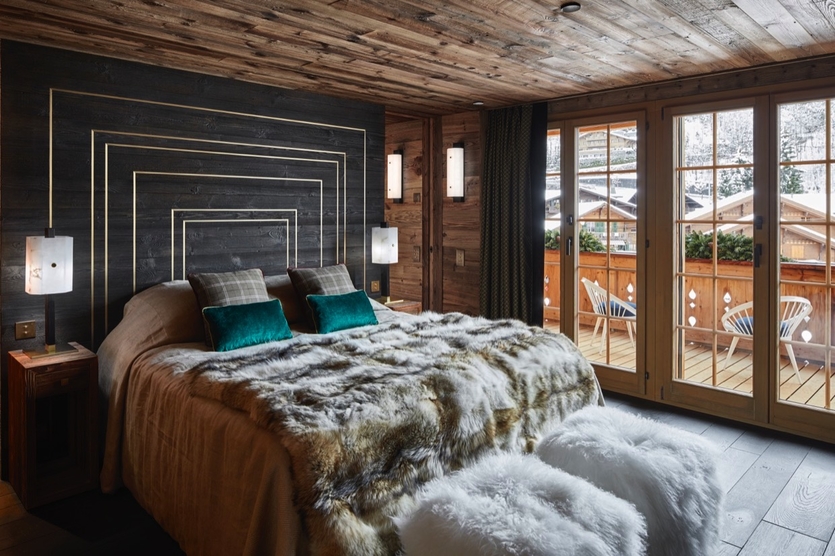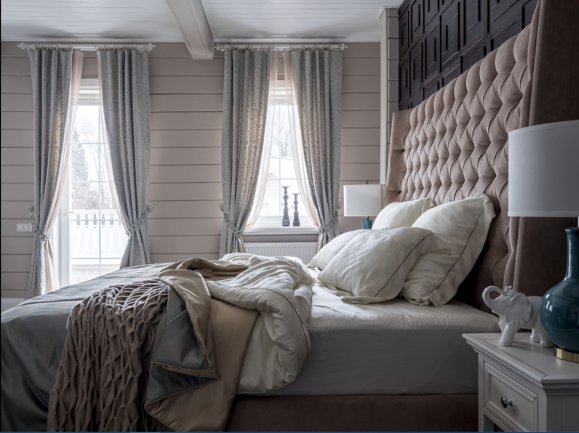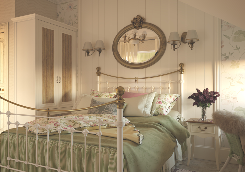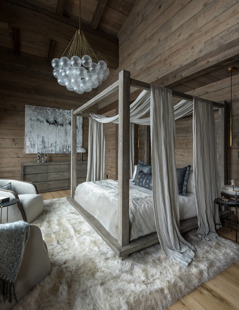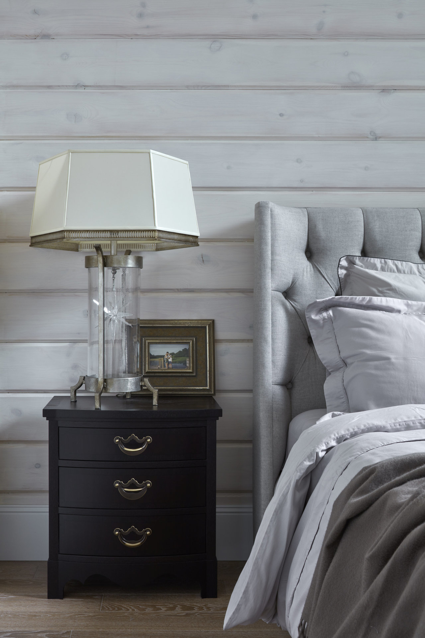 Шале. Эстетика уютных домиков лыжных курортов прекрасно впишется и в спальню дома любого российского коттеджного поселка. ДНК этого стиля — акцент на «зимние» плотные ткани, удобную низкую мебель, ретро-декор. Колеровать древесные поверхности можно как темными, так и светлыми оттенками.В такой спальне есть смысл ввести в интерьер обои. Подойдут покрытия, принтованые мелкими цветами или клеткой.