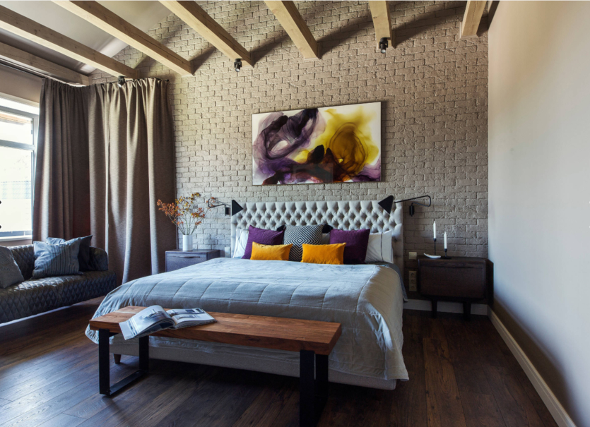 Комбинация притягивающих взгляд стен и нейтрального потолка подойдет для ярких, декоративных спален. Потолок в таком интерьере — для отдыха глазам.