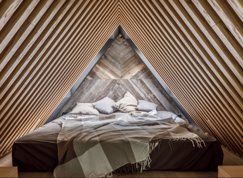 Чаще всего дизайнеры прибегают к этому приему, когда оформляют спокойные, монохромные спальные зоны, взяв за основу один цвет и множество его оттенков. Брус, скомпанованный с вагонкой, а бревенчатая кладка с деревянными панелями добавят интерьеру ритма и не дадут заскучать среди похожих цветов.