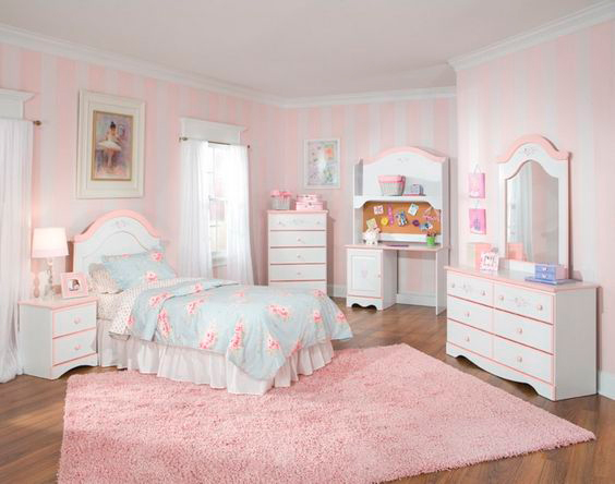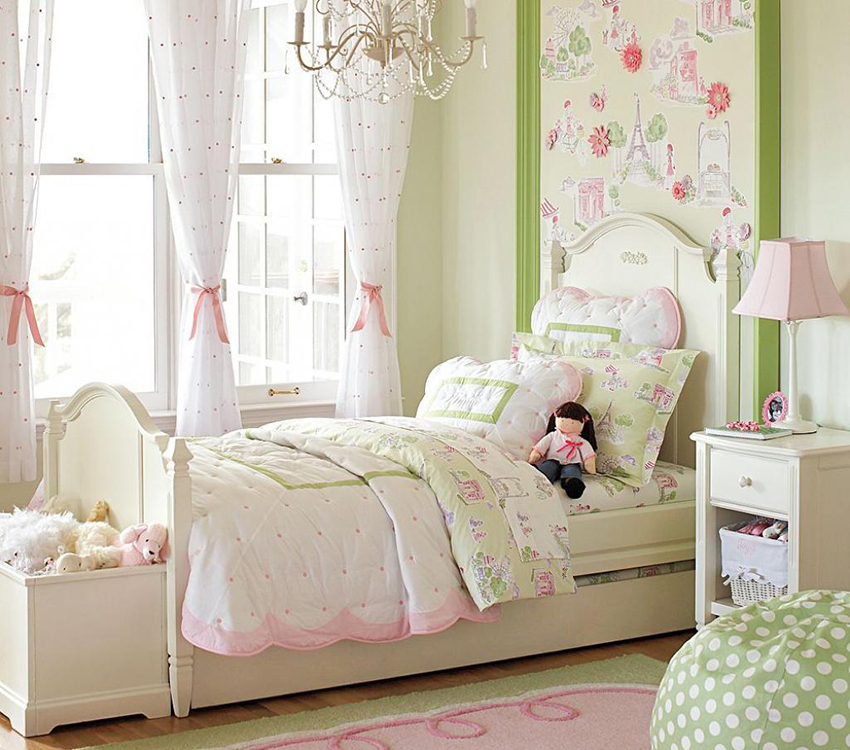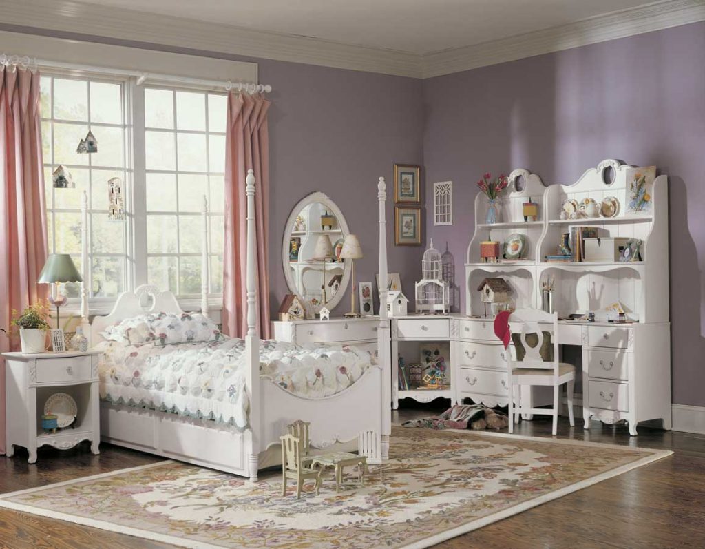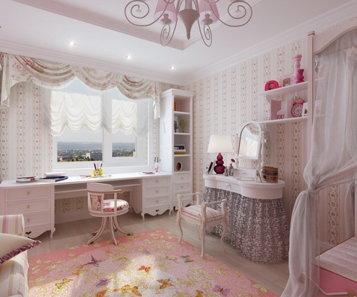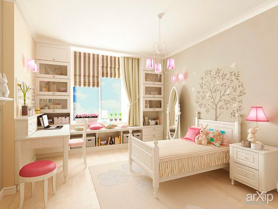 В качестве центрального элемента должна быть большая кровать. Украсить её можно ажурными вязаными подушками или просто стилизованным одеялом. Стоит задумать и о выделении места для туалетного столика, который будет способствовать расслаблению ребёнка после выполнения домашних заданий.