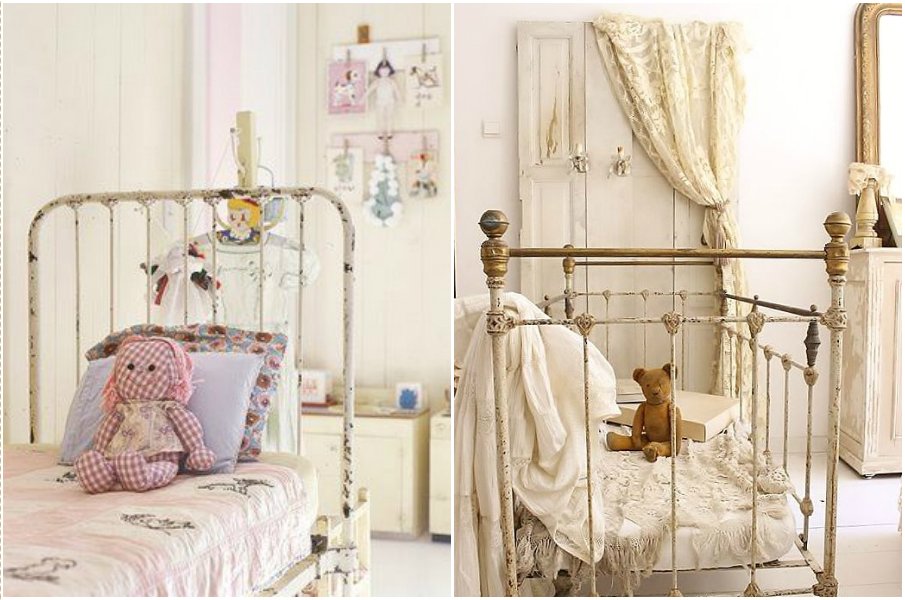 Создавая романтику прованс в детской комнате редко можно обойтись без подушечек и покрывал с мелким пестрым рисунком, а также без балдахина с аккуратными кисточками. Кованая спинка кровати при этом сама по себе уже выглядит старинной.