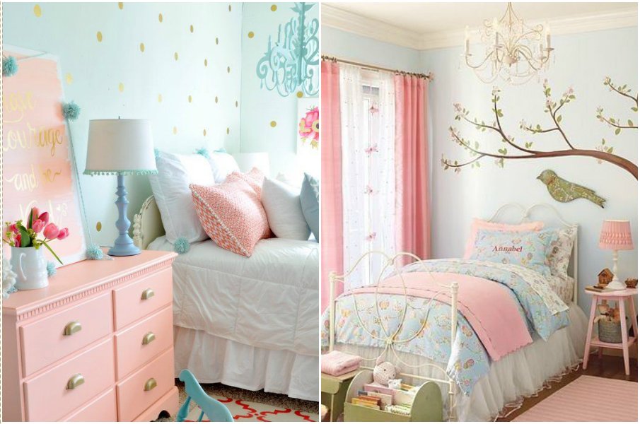 Рекомендуется применять при обустройстве детской светлые тона, оптимально – пастельные оттенки, создающие эффект выцветания. Не следует опасаться желтых, лавандовых, голубых, бледно-розовых, кремовых и зеленоватых оттенков. Для маленькой леди, комната которой ярко освещена солнцем, прекрасно подойдут холодные оттенки (голубой, розовый и лавандовый), если же детская теневая, то желательно оформить ее в теплых цветах (желтый, зеленый, цвет лимона).