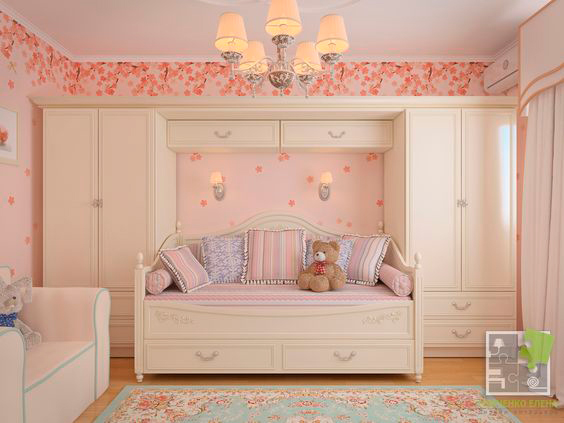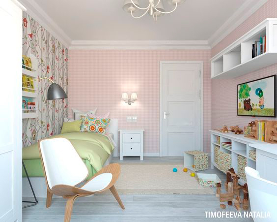 - Использование обоев светлых оттенков с растительным принтом, лучше, если это будет мелкий цветок. Подойдёт детям любого пола и возраста. Оттенок обоев лучше брать как можно светлее.