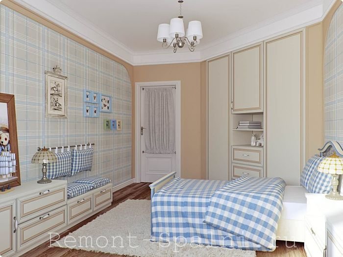 Детскую с классическим интерьером можно разнообразить, дополнив элементами в стиле прованс. Клетчатые неброские обои, лампа под старину и мебель натуральных оттенков, а также кровать со светлым покрывалом в небольшой нише создадут ощущение комфортной старины.