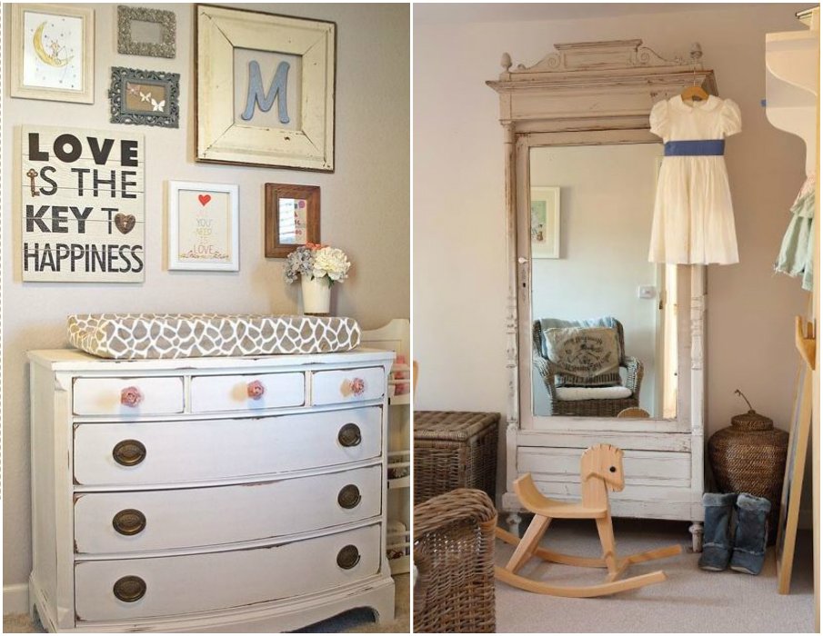 - Мебель белого цвета или искусственно состаренная, с различными потёртостями, трещинками необычных форм