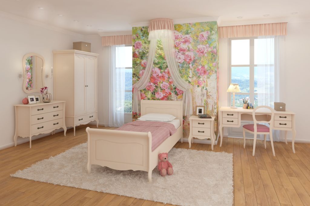 В основе каждого дизайна лежит грамотная подборка предметов интерьера. Для детской комнаты в стиле прованс подбирают мебель из натуральной древесины. Её форма зависит от общей идеи дизайна – лаконичная (с округлыми и изящными линиями) или по-деревенски простая.