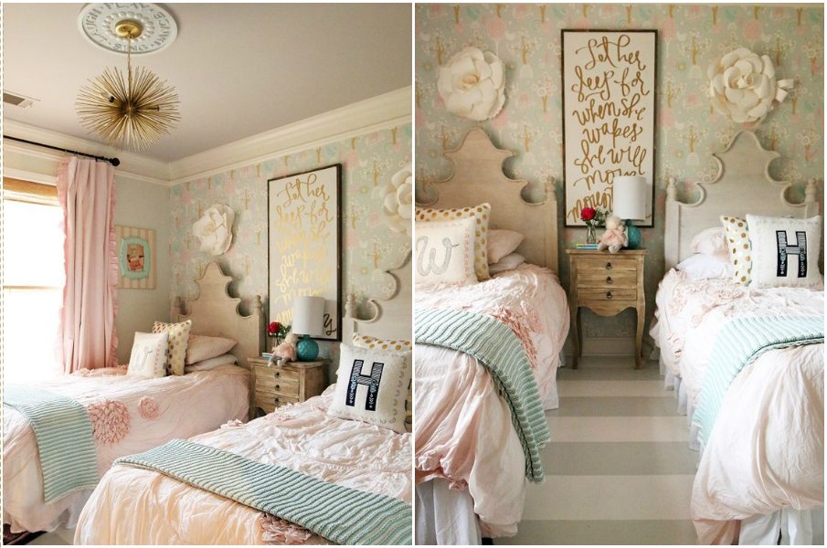 Стены оформлены однотонным цветом. Проводят эксперименты с фотообоями. Используют обои с мелкими цветочными или растительными мотивами. Пастельные тона стен визуально расширяют пространство, делают его невесомым и легким. Используется художественная роспись и другие интересные идеи.