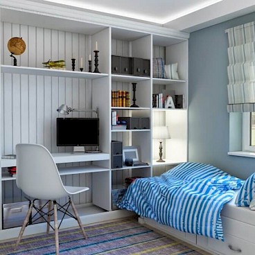 Что касается мебельных предметов, здесь потребуется поставить: кровать, шкаф для одежды, письменный стол, стол для игр, тумбочки и полки для книг.