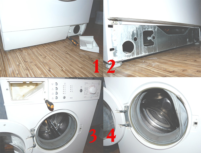 Ремонт или замена сливного насоса. Добраться до него можно, сняв переднюю панель машинки. Как это сделать? Вытащите лоток-распределитель для моющих средств. Открутите шуруп, расположенный справа внизу в открывшейся нише. Снимите нижнюю панель – для этого выкрутите шуруп рядом со сливным фильтром, потом шурупы в нижней части панели. Удалите металлическое кольцо, фиксирующее уплотнитель на люке, с помощью отвертки отогнув пружину, и демонтируйте сам уплотнитель. Потяните за нижний край передней панели и снимите ее. Чтобы снять насос, надо отсоединить провода от замка люка. Итак, насос у вас в руках. Разберите его и проверьте на наличие посторонних предметов. Крыльчатка механизма должна свободно вращаться в обе стороны. Если ничто не мешает ее движению, проверьте мультиметром сопротивление обмотки – показатель 200 Ом говорит о ее исправности.